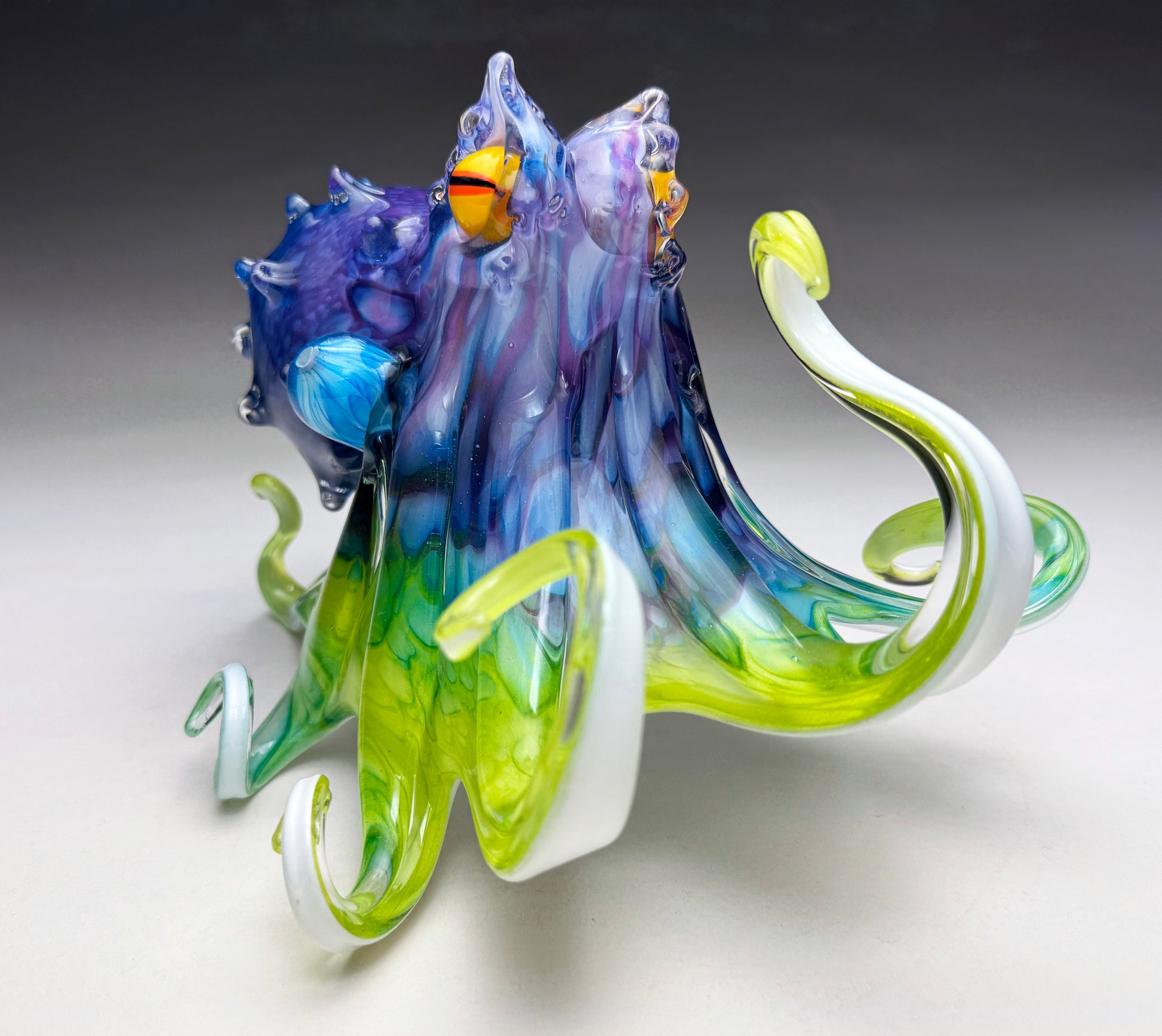 Blown and sculpted hot glass created by Jeff and Heather Thompson at their studio in Bend, Oregon. It is signed 'Thompson' and is also engraved with the artists' unique identifying number on the underside. This is a one-of-a-kind sculpture. You will receive the exact sculpture depicted in the photos. It will ship in a double boxed manner. Free shipping (insured) to USA addresses. International shipping is billed at actual cost and the customer is responsible for any duties or import fees. The dimensions are 6.5 inches tall, 10.5 inches wide and 7.5 inches deep.